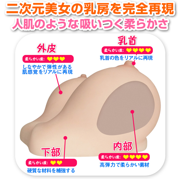 無臭でベタつき無く滑らかな質感の特殊素材仕様で仕立てた弾力とハリのある人肌感で美女の乳房をリアルに再現!部位によって異なる弾力が本物と錯覚させます♪コリコリ乳首としっとり吸い付く柔らかな豊満Gカップを揉みしだき、思う存分パイズリしちゃってください!ローション付
