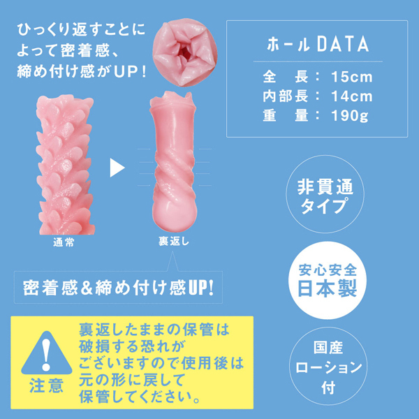| 新たなヒダの重なりが未体験の世界へ誘う非貫通オナホ。 裏と表で違った刺激が味わえるリバースタイプ!ひっくり返すことで密着感&締め付け感がUPする♪素材はモチモチねっとり絡みつく元祖おなぺっと仕様。 洗い流しやすく清潔に保ちやすい新感覚の日本製オナホ。 国産ローション付属 |