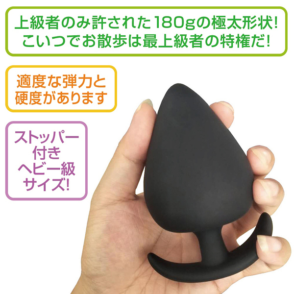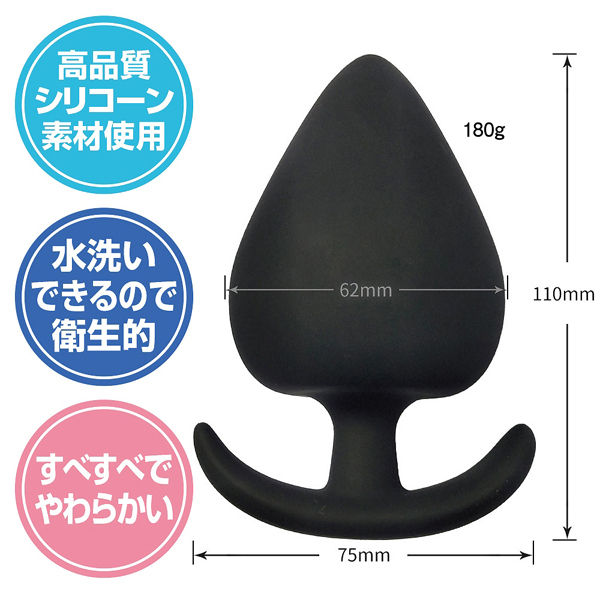 | 全長11cm、最大幅6.2cm!お尻の中を圧迫刺激する超特大180g仕様のストッパー付きプラグ。 上級者にのみ許されたヘビー級サイズ!すべすべと滑らかで適度な硬度&弾力の高品質シリコンを使用。 |