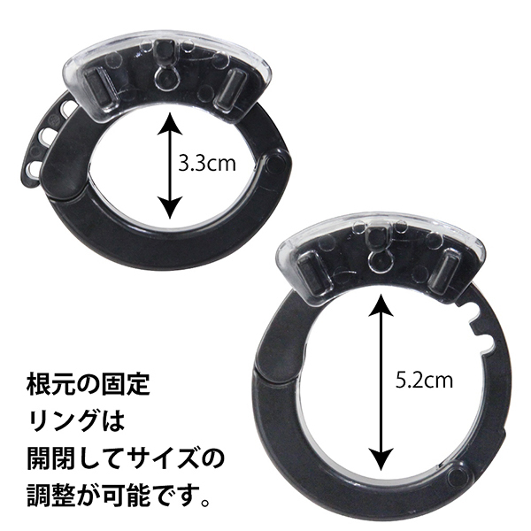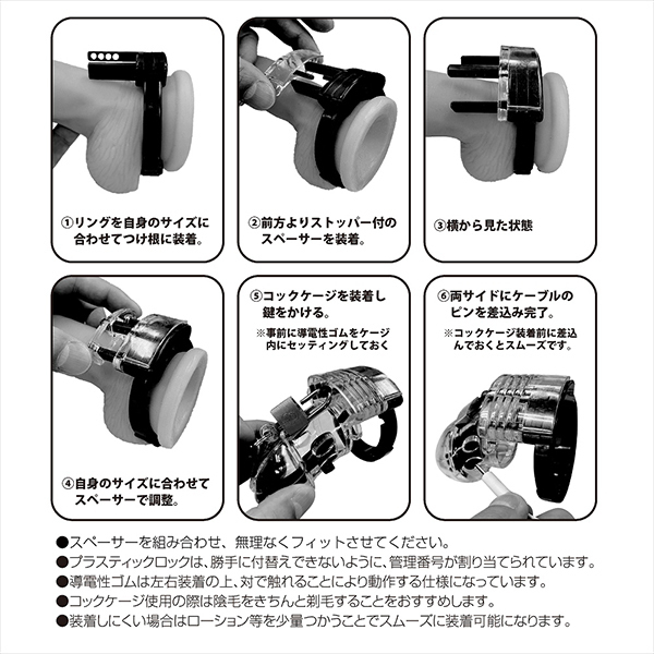 パッケージ:10.5×12.0×7.0cm 本体:ケージ内径3.2〜3.5cm・亀頭部の内径4.0cm・固定リング内径3.3〜5.2cm セット内容:コントローラー、コックケージ本体、導電性ゴム電極×2、スナップリング、スペーサー×4、金属製南京錠(鍵×2)、プラスティックロック×5、ケーブル 電池:単四電池×2本使用 |