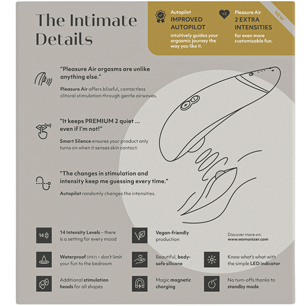 | ボタンを押さなくてもお肌に触れるだけで吸引できるタッチセンサーを搭載!あのウーマナイザープレミアムがバージョンアップした「ウーマナイザー プレミアム2 (グレー)」。 吸引強弱機能は12から14段階へパワーアップ!パイロットモードを搭載することで、ボタンの操作をしなくてもウーマナイザーが吸引の強弱を自動でコントロールしてくれます。 振動は弱・中・強の3段階!予測できない楽しみを味わいたいという人はもちろん、カップルさんで使うときにもこれらの機能は大活躍♪ボタン操作に慣れていない方でも感覚的にお楽しみ頂けます。 素材はシリコン/ABS樹脂で2時間のフル充電で連続4時間の使用が可能です。 ※製造時期によりパッケージが異なる場合がございます。 ※こちらの商品は受注発注商品の為、ご注文から発送までに3、4営業日掛かる場合が御座います。 |