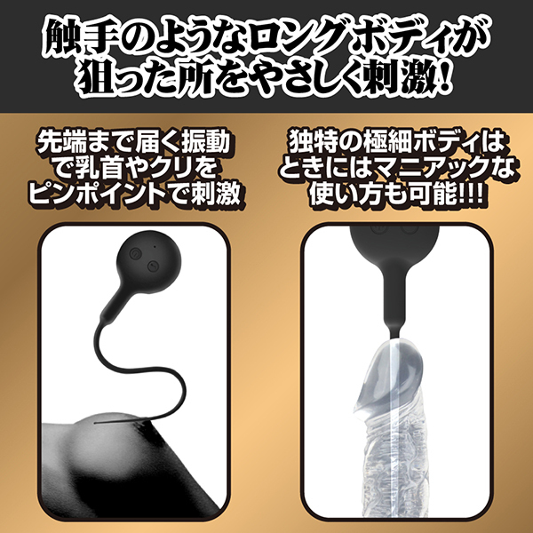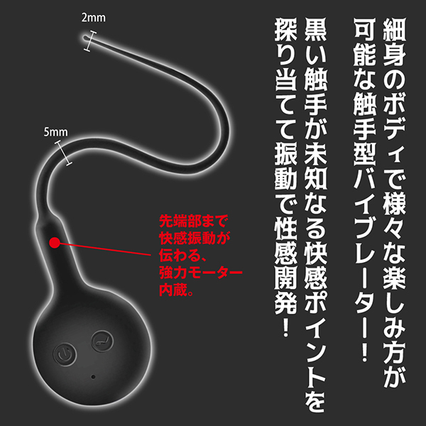 | 尿道プレイにも大活躍!クリにも乳首にも楽しめる触手のようなローター「ブラックテンタクル」です。 7種類の振動パターンを搭載していてIPX6等級の防水性と静音設計が自慢♪コントローラー部分から尻尾のように伸びた触手みたいな部分がくねくねと曲がることで狙いたいところをピンポイントに責めたり刺激することができます!先端部分の太さは2mm、最大でも5mmという太さだから、尿道に挿入しての振動体験など他では味わえない刺激が楽しめます。 ※尿道に挿入する際は必ず滅菌や消毒を行い衛生面にお気をつけください!素材は高品質なシリコン素材の触手型バイブレーターで給電はUSB充電式です。 |