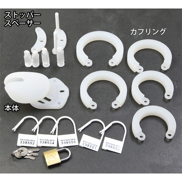 パッケージ:15.3×17.9×5.2cm 本体:全長6.5cm・挿入口内径(縦3.3×横3.4cm)・カフリング内径(3.8・4.0・4.5・4.8・5.0cm) セット内容:本体、カフリング×5、リング固定パーツ、スペーサー×4、ストッパー棒×4、南京錠、プラスチックキー×5、日本語説明書 |