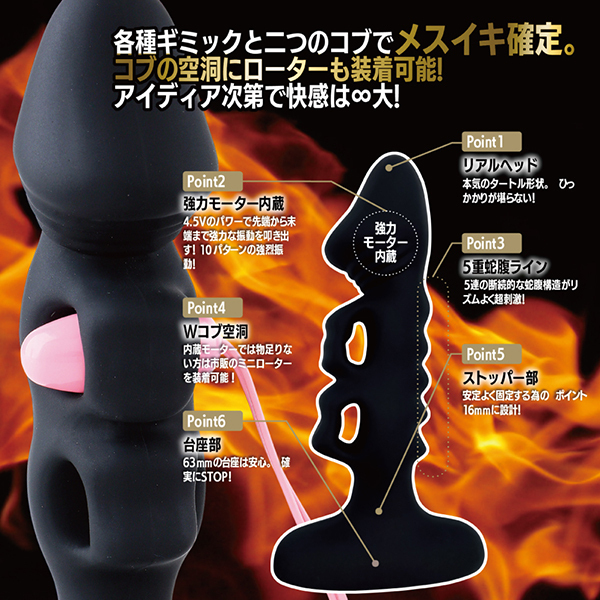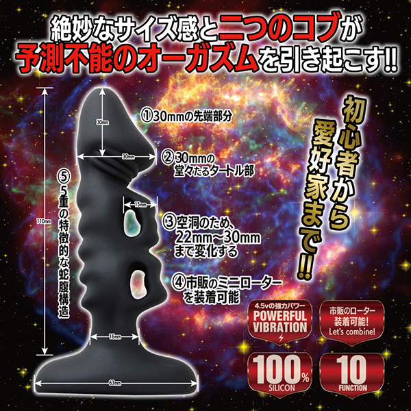 | 刺激的なデコボコが効いたフォルムと単四電池3本使用のハイパワーが自慢の「バックファイアー アエナスキャメル」です。 4.5Vの強力パワーと10ファンクションシステムを搭載♪100%シリコンの電動アナルプラグで、強力な振動と独特な形状が嫌というほど攻めまくる!アエナスキャメルは二重のコブが圧迫・刺激・強烈な振動を叩き出す♪絶妙な2つのコブが予測不能のオーガズムを存分にご堪能あれ。 |