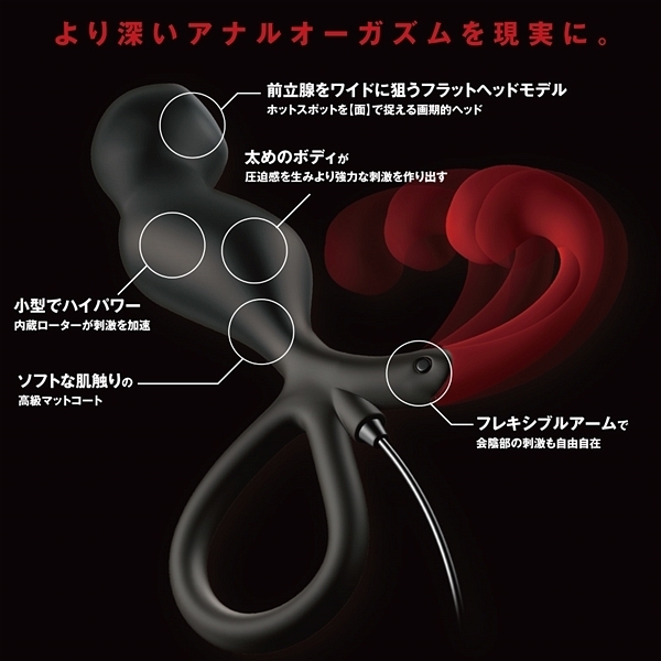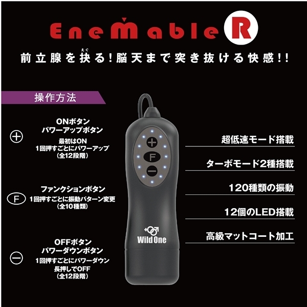 | お手軽さが人気の前立腺開発グッズ「エネマブルR」に上級者タイプが新登場!3段階に可動するアームが自由自在に会陰部を刺激する♪12段階の強弱と10種類の振動パターンによる120種類の振動が前立腺をえぐる!初心者から上級者にまで愛される洗練されたフォルムが前立腺を的確に刺激しながら悶絶のドライオーガズムへと誘います。 全体的に太さもあり、挿入時の圧迫感も同時に楽しめる逸品♪3段階に可動するフックで会陰部への刺激も自由自在にお楽しみ頂けます! |