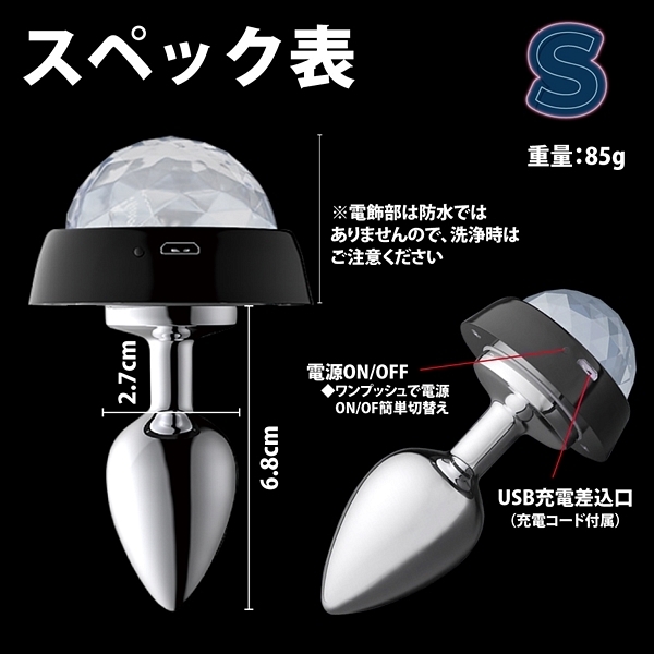 | ステンレス製でテール部分に埋め込まれた電飾のLEDライトがサウンドに合わせて光がアクションする「アナルパーリーピーポー」です♪アナルで超パリピになれるという画期的なプラグが新登場!3種類の鮮やかな光(LED)が部屋を彩るアナルパーリーピーポーは3サイズ展開♪こちらは初心者向けのSサイズです!光るアナルプラグでパリピに楽しもう♪電源はUSB充電式ですが電飾部分は防水じゃないのでメンテ時にはご注意ください。 |