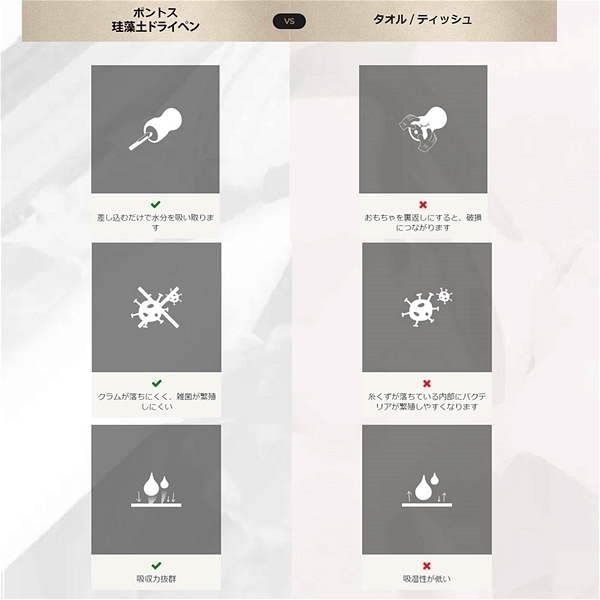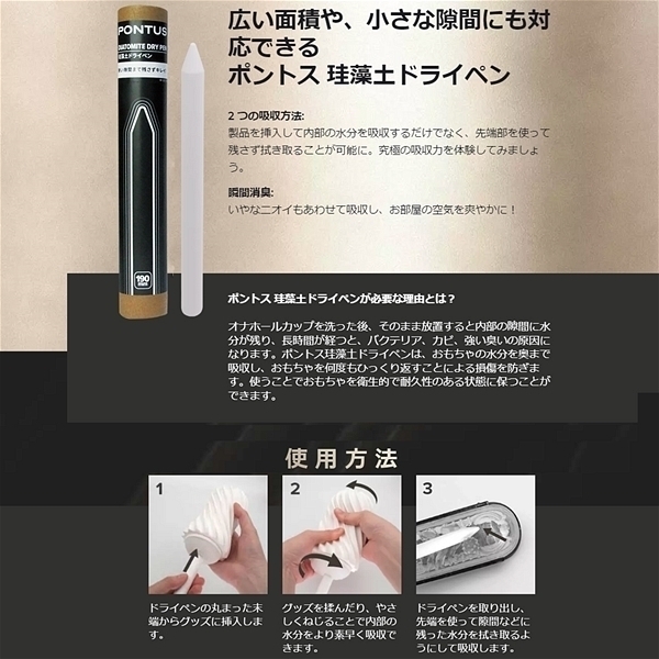 | オナホールカップを洗った後そのまま放置すると内部の隙間に水分が残り長時間が経つと、バクテリア、カビ、強い臭いの原因になります。 ポントス珪藻土ドライペンは、おもちゃの水分を奥まで吸収し、おもちゃを何度もひっくり返すことによる損傷を防ぎます。 使うことでおもちゃを衛生的で耐久性のある状態に保つことができます。 |
