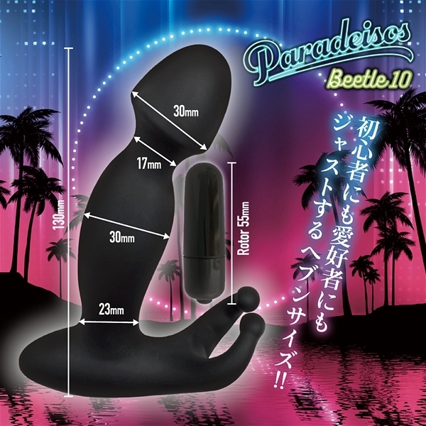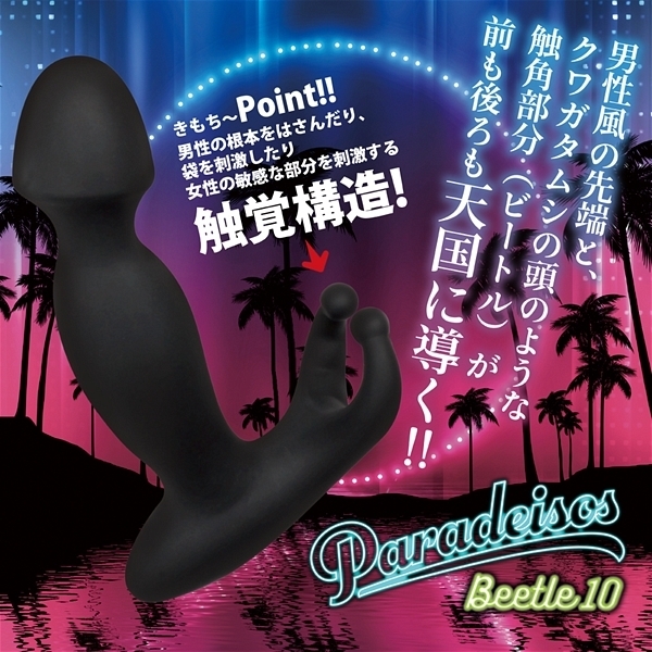 | ビートル10は男性器のような形状の先端と、クワガタムシの頭のような触角部分(ビートル)をもっています。 男性が使用すれば、先端部はグリグリと奥へ入り込みディルド全体が大きく振動し驚きの天国体験を味わえます。 女性が使用すれば確実にGスポットを刺激して天国体験が味わえます。 |