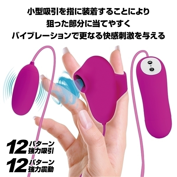 | 指装着型の小型吸引ローターが的確にCスポットを快感刺激。 同時にもう一つのローターがピンポイントに中も外も刺激する多機能型一体ローター●12パターン強力吸引●12パターン強力震動●高品質シリコン素材●生活防水 |