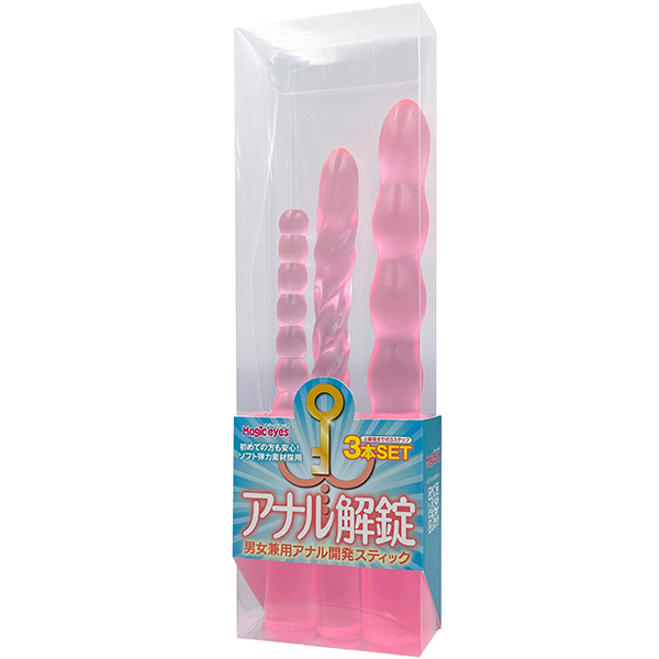 | 初めてのアナルから3ステップ開発用3本セット!!男女兼用ソフトな弾力素材を採用した日本製。 STEP1全長150mm先端部の径10mmのつぶつぶスティック。 STEP2全長170mm先端部の径13mmの拡張しつつ刺激も楽しめるらせん状スティック。 STEP3全長180mm先端部の径16mmのパール風ロングスティック。 ●カラー:ピンク |