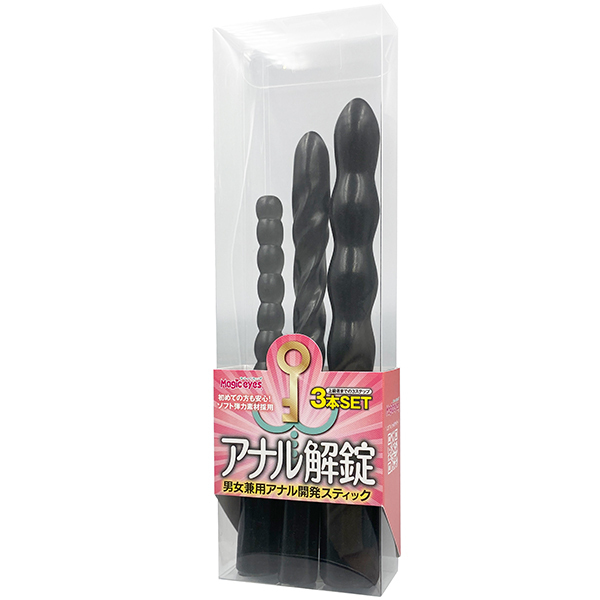 | 初めてのアナルから3ステップ開発用3本セット!!男女兼用ソフトな弾力素材を採用した日本製。 STEP1全長150mm先端部の径10mmのつぶつぶスティック。 STEP2全長170mm先端部の径13mmの拡張しつつ刺激も楽しめるらせん状スティック。 STEP3全長180mm先端部の径16mmのパール風ロングスティック。 ●カラー:スモーク |