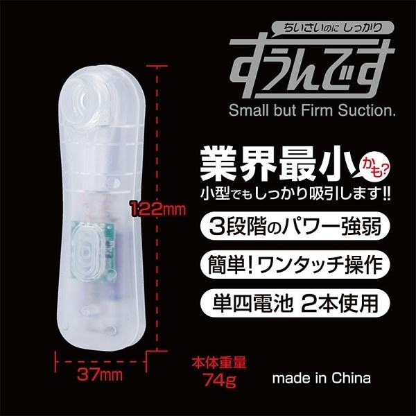| 現在、流行中の吸引系ローター。 その中でも最小・最軽量・最安を目指して作られたのが、この「すうんです」です。 単四電池2本を入れ、電源スイッチ長押しでスタート。 あとは電源スイッチを短押しすることで、3段階のパワー強弱をお楽しみいただけます。 本製品は小型で簡易的なモデルですが、十分な吸引力を発揮。 手軽に、コンパクトに、吸引ロータを楽しむことが可能です。 最小・最軽量・最安にこだわった吸引ローター「すうんです」。 小型だからと侮らずに、お試しください。 ●カラー:スケルトンクリア |