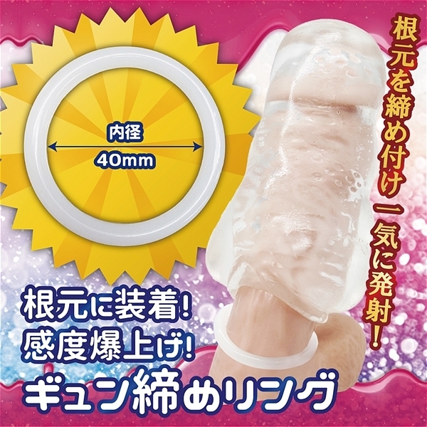 | とろけるゼリーのようなホールと、ギュッと締めるリングの快感満点セット!とろけるやわもちホールと感度爆上げのギュン締めリング、さらにたっぷり楽しめるローションが付属。 ●イボイボしめリング |