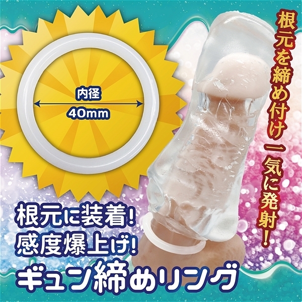 | とろけるゼリーのようなホールと、ギュッと締めるリングの快感満点セット!とろけるやわもちホールと感度爆上げのギュン締めリング、さらにたっぷり楽しめるローションが付属。 ●吸いつきせまリング |
