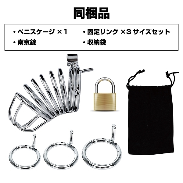 パッケージ:28.0×18.5cm 本体:ペニスゲージ11.2×3.5cm・固定リング小(内径4.0cm)・固定リング中(内径4.5cm)・固定リング大(内径5.0cm) セット内容:ペニスゲージ、固定リング3サイズセット、南京錠、収納袋 |