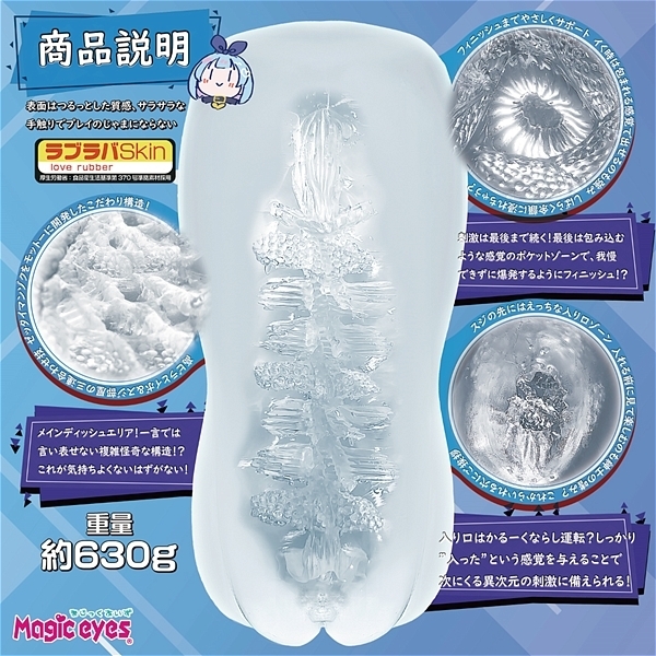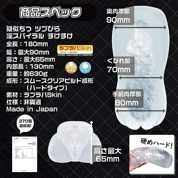 | 630gの極まる肉厚!奥に行けば行くほど肉厚になる希少な壷状肉厚構造!ねじれた高ヒダに細かなツブツブが刺激となりながら最奥部の子宮口で絞りとります。 「すけすけ」は固めの硬度で設定されているので強めの刺激を求めている方に最適!厚労省、食品衛生基準第370号準拠素材のラブラバSkinを採用しているので安心してご使用して頂けます。 |