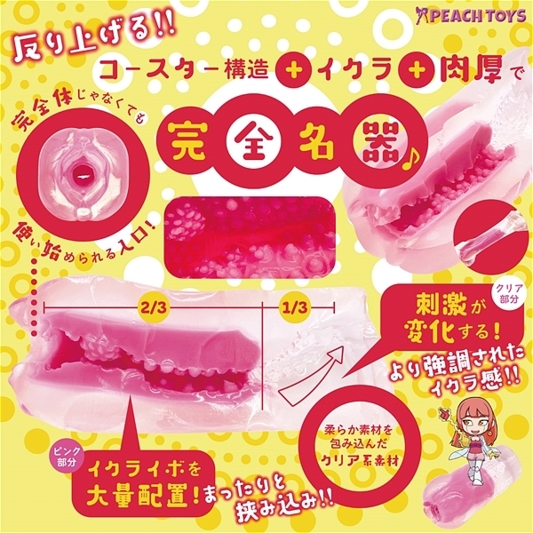 | 無数のイクラでプリクニュッ!カズノコサンドの粒イボではない、イクラのような大きさのイボを使用。 イボは柔らかな素材を使用し、外を硬めの素材が包み込むため独特の使用感を感じることが出来ます。 入口から2/3は比較的まったりでまるでフ〇ラのような優しい独特の感触ですが最後の1/3はフィニッシュのためにしっかりとした刺激を感じ取れるように外側と同素材になっています。 |