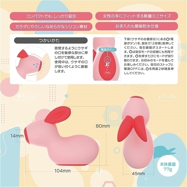| 赤ちゃんウサギのちゅっちゅ吸引。 女性向け性感プレジャーアイテム「Stella(ステラ)」から、ウサギの人形みたいな吸引バイブがデビューしました。 小さなインテリアのようにお部屋になじむ可愛らしさです。 14mmの大口径で深さもたっぷりな吸引穴は、かわいい見た目からは意外に思えるほど、深く重い吸引振動を生み出します。 満充電なら140分の連続使用が可能です。 (充電が切れた状態からの充電は、満タンになるまで約80分必要です) |