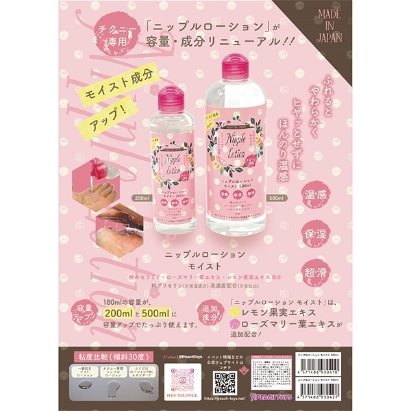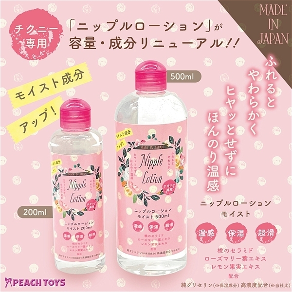 | 「チクニー専用 ニップルローション(180ml)」が、容量と成分をリニューアルして新発売!!500mlに容量アップでたっぷり使えます。 追加成分!「ニップルローション モイスト」は、レモン果実エキス・ローズマリー葉エキスを追加配合!チクニー専用ニップルローションは、ふれるとやわらかくヒヤッとせずにほんのり温感タイプでとても使いやすい商品です。 |