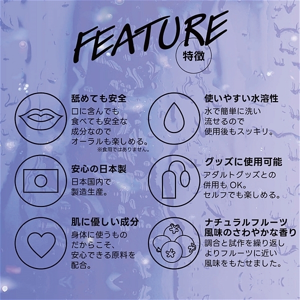 | ブルーベリー。 フルーティーな味と香りで新感覚プレイ!ワイルドワン女子が企画・開発した女性のためのフレバーローション!安心安全の国内素材で水のように「超さらさら」、フルーツみたいに美味しい水溶性ローションです!<成分>精製水、PG、ポリクオタニウム-39、グリセリン、サッカリンNa、ヒアルロン酸Na、ハチミツ、アロエベラ葉エキス、香料、青色1号、赤色106号、BG、エタノール、メチルパラベン、エチルパラベン、プロピルパラベン、ブチルカルバミン酸ヨウ化プロビニル。 ※「本製品はバイブバー公式認定ローション 味・香り付き」の後継として開発されましたが味と香り付きという点以外は、成分もテクスチャもまったく異なる新製品です。 |