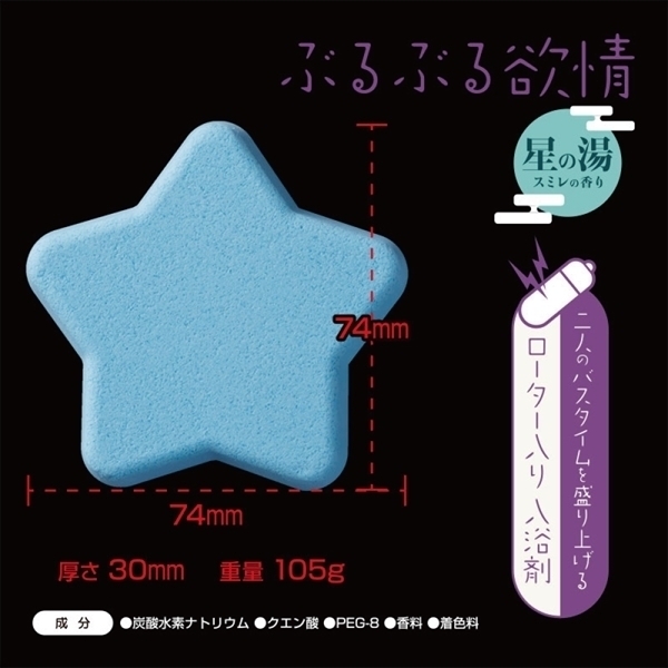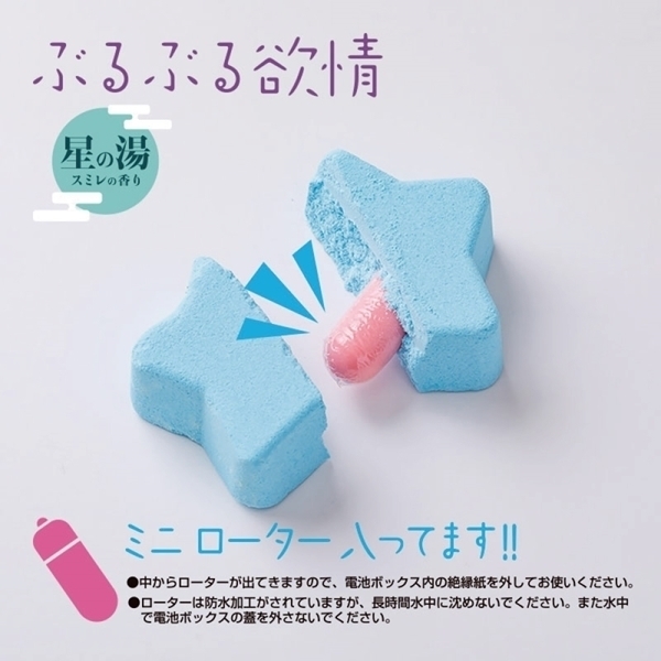 | 二人のバスタイムを盛り上げるローター入り入浴剤。 『ぶるぶる欲情 星の湯』の発売です。 この『ぶるぶる欲情 星の湯』はスミレの香りが心地良い入浴剤です。 と言ってもただの入浴剤じゃありません。 湯船に入れて溶け出すと、なんと中からローターが出てくるんです!カップルでイチャイチャとお風呂に入りながら、盛り上がること間違いなしの逸品です。 ローターは防水加工がなされており、お風呂の中でも使用することが可能です(ただし湯船の中で電池ボックスを開けないでください)。 |