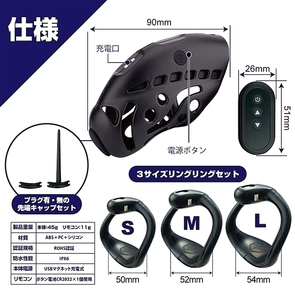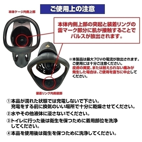 | 射精管理電流調教!悶絶!電撃低周波パルスコックケージの新商品が登場!熱や衝撃に強いABS樹脂で造形された、見た目もスタイリッシュな見た目。 陰茎上部とリングの二か所から放出されるパルスは、9段階強さの調整が可能。 初心者でも安心な弱パルスから、痛みを伴う強パルスまで、レベルに合わせて使用可能。 自身のサイズに合わせやすい、3サイズのリング付き。 |