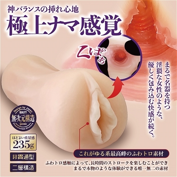 | ふわトロとぐちょ濡れ名器のコラボレーション。 ゆるふわな感触により長時間ストロークを楽しむ「ふわトロ」と有機的な内部構造で搾り取る「ぐちょ濡れ名器」のリアル感。 淫猥は横ヒダとイボの肉壁バランスが良いふわトロ素材との相性を考えたバランス構造。 80ml本気汁付属 |