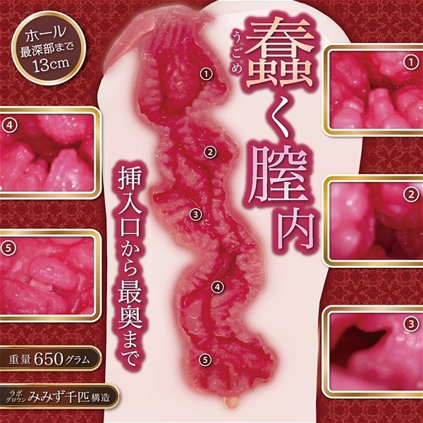 | 挿入口から最奥まで蠢(うごめ)く膣内。 「ひめはじめ」は名器の代表格「みみず千匹」の再現がコンセプトのオナホールです。 開発目標としたのは「うねうねと旋廻し、まとわりつく粘膜」の具現化。 この使用感を実現されるため「蛇腹の太ヒダ」を不規則に絡ませ、挿入口から最奥まで「びっしりと螺旋状」に巻きつけました。 |