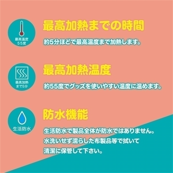 いつものグッズに体温のような温もりを与えて本物に近い体験を!スタンドタイプのウォーマなので温める時だけでは無く、使用後の乾燥にも使用可能です。