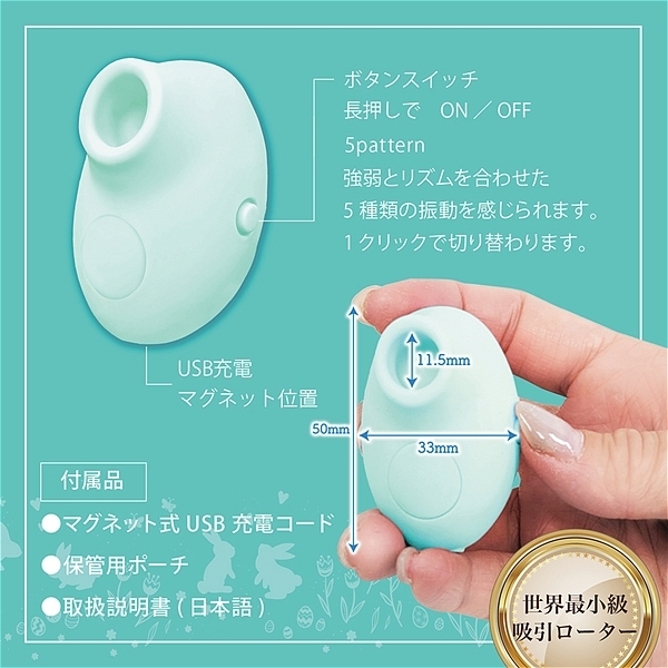 | 陰核体(クリトリス)への吸引機能がついたセルフプレジャーアイテム。 アンケートで女性に好評だったパステルカラー3色が揃ってデビュー!「エアーバルブ方式」を採用し、近年発売されるトイの中でも注目度の高い吸引系グッズを、世界最小レベルの超小型化に成功。 握ると手の中に隠れてしまうほどの極小サイズです。 段階を経て優しく吸引することにより、心地の良いオーガズムを体感することができます。 ●カラー:グリーン |