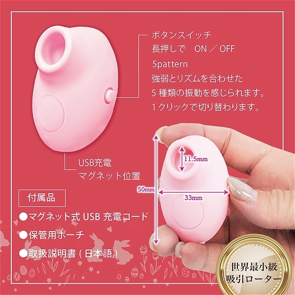 | 陰核体(クリトリス)への吸引機能がついたセルフプレジャーアイテム。 アンケートで女性に好評だったパステルカラー3色が揃ってデビュー!「エアーバルブ方式」を採用し、近年発売されるトイの中でも注目度の高い吸引系グッズを、世界最小レベルの超小型化に成功。 握ると手の中に隠れてしまうほどの極小サイズです。 段階を経て優しく吸引することにより、心地の良いオーガズムを体感することができます。 ●カラー:ピンク |