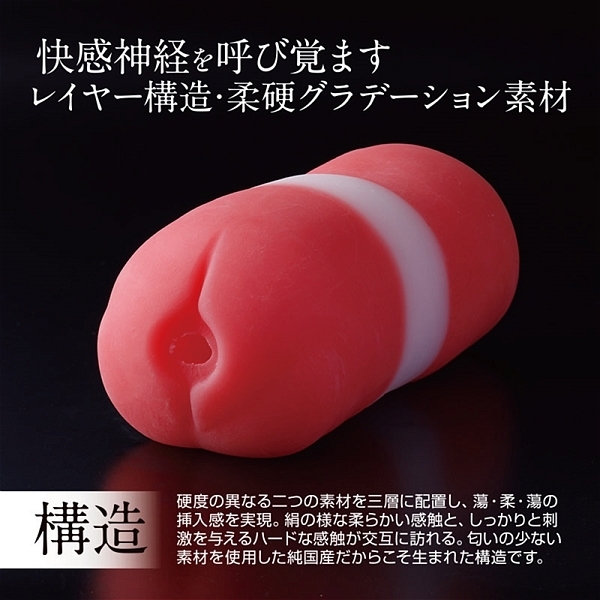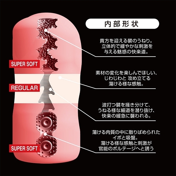 | 靡唇は硬度の異なる二つの素材を三層に配置し、蕩・柔・蕩の挿入感を実現しました。 絹の様な柔らかい感触と、しっかりと刺激を与えるハードな感触が交互に訪れます。 また内部構造は立体的なひだのうねりで刺激を与える入り口部分。 波打つようなヒダの細道が特徴的な中間部。 イボと吸盤がしっとりと射精へと導く最奥部。 これらは快感を高めるために考えられた構造になっています。 |