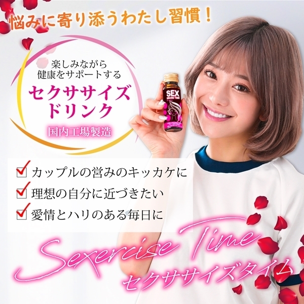 | 心身ともに自分を高めたい貴女のためのサポートドリンクです♪業界初の「セクササイズ」を実現しました!黒ショウガエキス末、マカエキス末、ムクナエキス末、L−カルニチンフマル酸塩の4つの厳選成分を配合しています♪毎日にメリハリをつけたい方にぴったりのドリンクです!悩みに向き合いたい方、理想の自分に近づきたい方にもおすすめ♪SEXERCISE TIMEは、身も心もスッキリとした充実した日々を目指し、愛情とハリのある毎日へと導きます。 【お召上がり方】1日1本を目安に、よく振ってお召し上がりください♪【ご注意】原材料が沈殿を生じたり、時間の経過によって液色が変化する場合がありますが、品質には問題ありません。 |