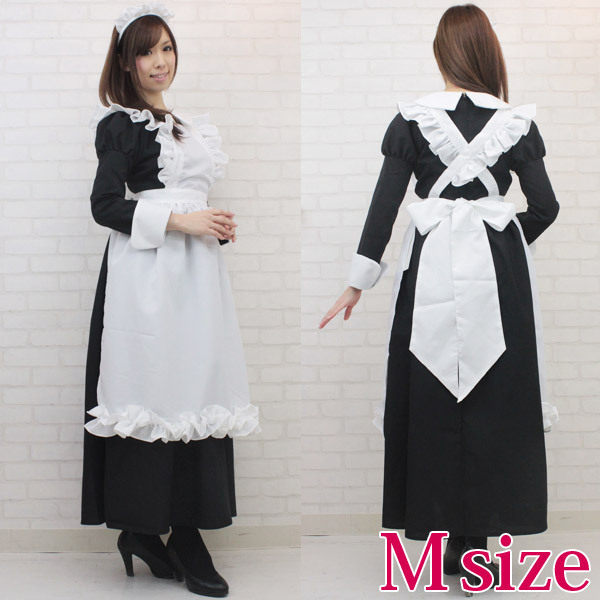 Mサイズ:B72〜84cm・W58〜69cm 丈:ワンピース128cm(肩幅37cm、袖丈56cm)、エプロン113cm セット内容:ワンピース(首周りホック有り、後ろファスナー)・エプロン(2段階長さ調節ボタンあり)・カチューシャ |