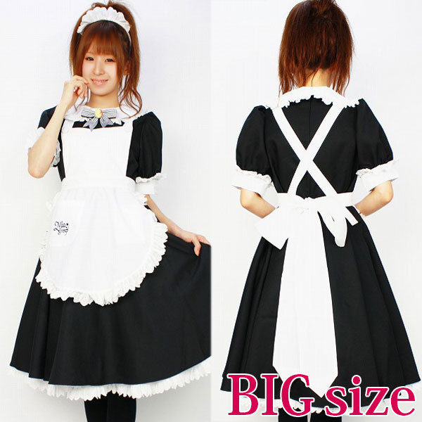 BIGサイズ:B92〜100cm・W78〜84cm 丈:ワンピース108cm(袖丈30cm)・ペチコート67cm セット内容:ワンピース(後ろファスナー、袖パフスリーブ、袖、襟繰りにレース付)・エプロン(肩紐下部にボタン付、ポケット付)・ペチコート(裾レース付、ウェストゴム仕様)・カチューシャ(全フリル)・ブローチ(安全ピン付)・メイドキャップ(クリップ付) |