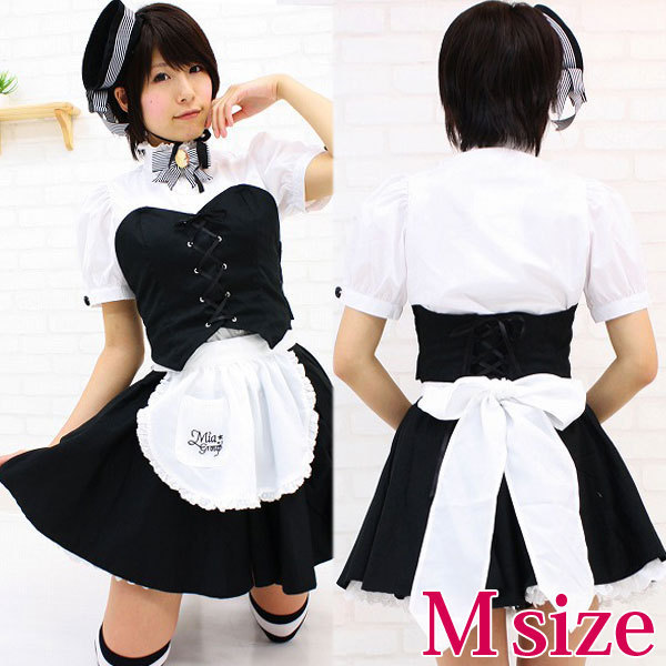 Mサイズ:B80〜87cm・W65〜70cm 丈:シャツ61cm(袖丈24cm)・ビスチェ30cm・スカート40cm・ペチコート36cm セット内容:シャツ(前ボタン、立て襟、襟繰りレース、胸部にビスチェ固定用のスナップ付)・ビスチェ(横ファスナー、内側にシャツ固定用のスナップ付)・エプロン・スカート・ペチコート(裾レース)・カチューシャ・帽子・ブローチ |