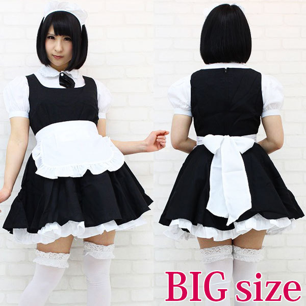 BIGサイズ:B〜104cm・W〜86cm 丈:ワンピース83cm(裾フリル含む)・ブラウス63cm(袖丈25cm、袖幅35cm、肩幅47cm、首周り43cm) セット内容:ブラウス、タイ(ナップボタンにて取り外し可能)、ワンピース(背中ファスナー)、エプロン、カチューシャ |
