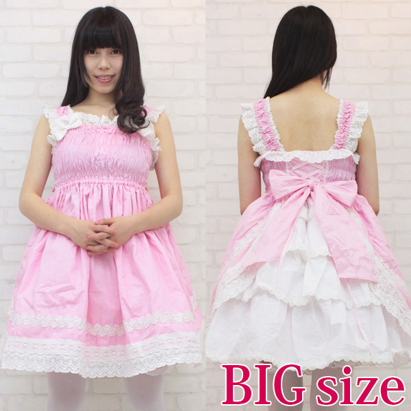 BIGサイズ:B76〜110cm・W70〜116cm 丈:ジャンパースカート88cm セット内容:ジャンパースカート(横ファスナー、後ろ編み上げ、バストからウエスト部分シャーリングあり、肩紐ゴム入り、スカート部分裏地有り) |