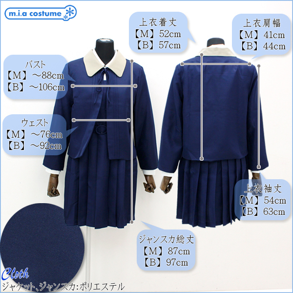 | セット内容:ジャケット(襟取り外し可・肩パッド入り)、丸襟ブラウス(前開き・ボタン留め)、ジャンパースカート(バストからウエスト部分に肩ボタンとサイドボタンで着脱可・ベルト取り外し可)、ベルト ※レトロな雰囲気漂うボレロが可愛らしい制服コスプレ(BIG)。 中に着たジャンパースカートは、ハイウエストのノースリーブ仕様!お洒落のボレロの襟とリボンがポイントに!リブハイソックスや黒タイツと合わせて着こなしたい、お嬢様学校風の制服コスチュームです。 ※水洗い不可、塩素系漂白剤による漂白不可、アイロンは中温で当て布使用、ドライクリーニング可、色落ちの可能性があります。 ※こちらの商品は在庫の状況によりお届けまでに4日〜7日程度かかる場合がございます。 |