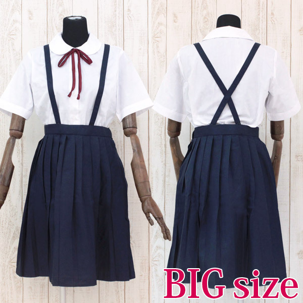 BIGサイズ:B85〜112cm・W76〜91cm 上衣:着丈69cm・袖丈27cm・肩幅45cm スカート:着丈61cm・吊り紐88cm(1本) セット内容:上衣シャツ、吊りスカート(三段ホック)、紐タイ 素材:上衣シャツ(ポリエステル65%綿35%)、スカート(ポリエステル100%) |