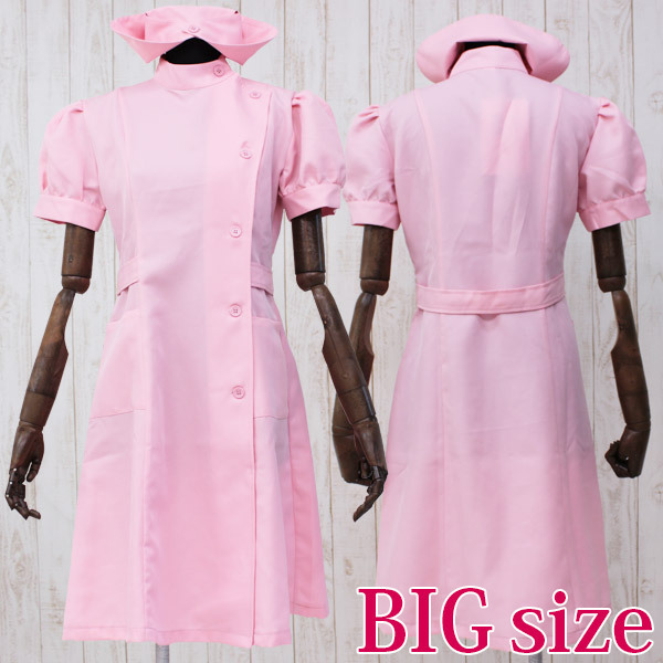 BIGサイズ:B98〜108cm・W86〜96cm ワンピース:着丈110cm 肩幅48cm 首周り45cm 袖丈28cm 袖口周り35cm セット内容:ワンピース(前ボタン留め・立て襟・ポケット付き・裏地無し)、ナースキャップ 素材:ポリエステル100% |