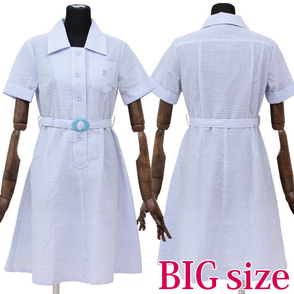 BIGサイズ:B〜102cm・W〜92cm 着丈99cm 袖丈24cm 肩幅43cm セット内容:ワンピース(前ボタン・スカートポケットあり)、ベルト(長さ調節可・、スナップボタン付き) 素材:ポリエステル65%、コットン35% |