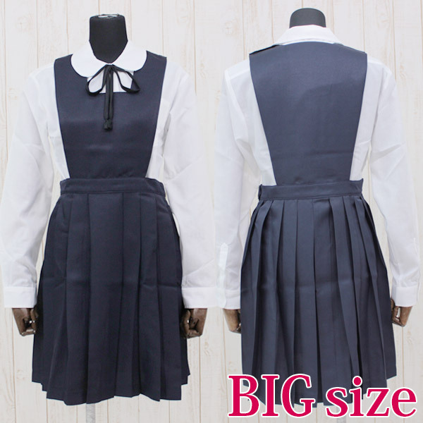 BIGサイズ:B〜116cm・W〜97cm ブラウス:着丈78cm・袖丈64cm・肩幅50cm・首周り43cm・手首周り24cm ジャンパースカート丈97cm 紐タイ130cm セット内容:ブラウス(丸襟、前ボタン留め)、ジャンパースカート(上半身裏地付き、左肩とウエストにスナップボタン有り、ホック着脱可)、紐タイ |