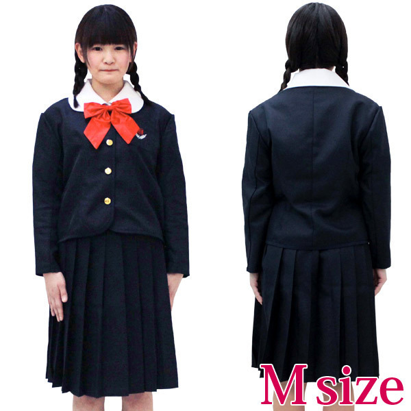 Mサイズ:B〜95cm・W〜72cm ブラウス:着丈56cm・袖丈18cm・肩幅40cm・首周り40cm ジャケット:着丈51cm・袖丈49cm・肩幅42cm スカート:丈57cm・吊り紐87cm セット内容:ブラウス・ジャケット(前ボタン留、胸ポケット有)、スカート(サイドファスナー、3段ホック留め、ウェスト一部ゴム入)、リボン(アジャスター調整可) |