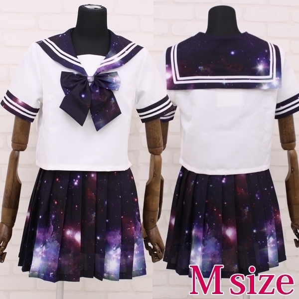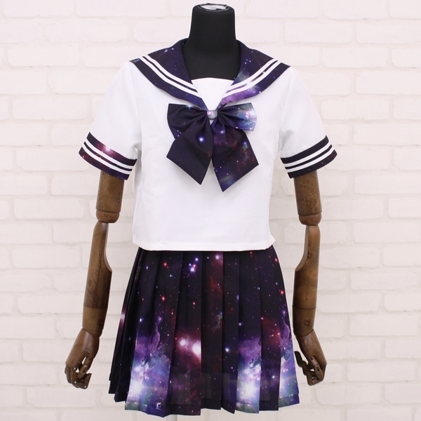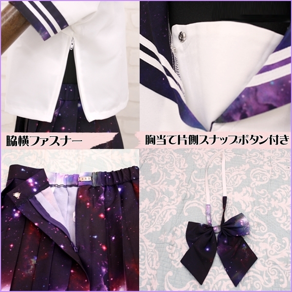 | ロマンティックで幻想的な宇宙柄♪フォトプリントデザインのセーラー服コスプレ。 ●インパクト抜群の宇宙柄●オシャレで神秘的な紫カラー●セーラートップス&スカート●お揃い柄のリボンもセット。 数多の星や銀河が美しい宇宙柄がプリントされたセーラー服コスチューム!黒や白のニーハイからハイソックスまで何でも合わせられます。 ※水洗い不可、塩素系漂白剤による漂白不可、アイロンは中温で当て布使用、ドライクリーニング可、色落ちの可能性があります、ご注意ください ※本製品は、生地の裁断工程により柄の位置(模様)に個体差が生じます。 |