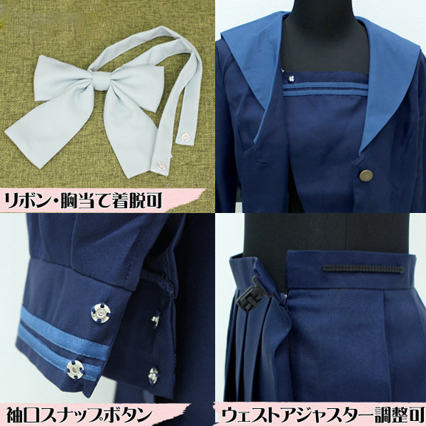 | 学生らしいさわやかなブルー系♪襟の色が特徴的な人気の旧冬服セーラー服(Mサイズ)。 紺無地のセーラーブラウスとプリーツスカートに、ブルーグリーンのリボンがポイントの制服コスプレ。 胸当てとリボンはスナップボタンで着脱可能です。 ※水洗い不可、塩素系漂白剤による漂白不可、アイロンは中温で当て布使用、ドライクリーニング可、色落ちの可能性があります。 |