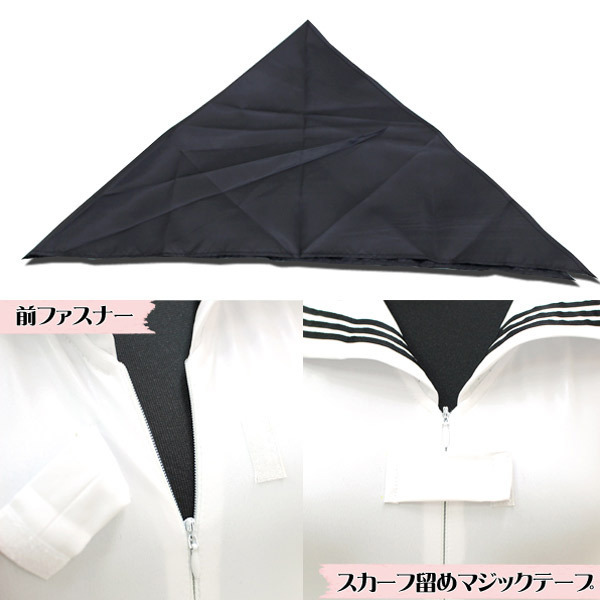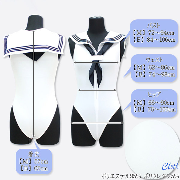 Mサイズ:B72〜94cm・W62〜86cm・H66〜90cm 着丈57cm セット内容:レオタード(前ファスナー)、スカーフ(マジックテープ) 素材:ポリエステル95%、ポリウレタン5% セーラーノースリーブレオタード 色:白 |