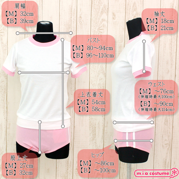 Mサイズ B80〜94cm・W〜76cm(伸縮時最大100cm)・H〜86cm 上衣:着丈54cm・肩幅32cm・袖丈18cm ブルマ:股上丈27cm セット内容:上衣、ブルマ 素材:ポリエステル65%、コットン35% |