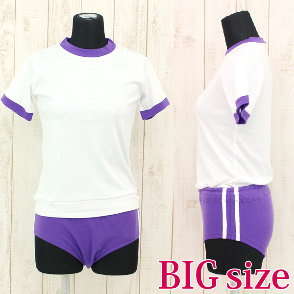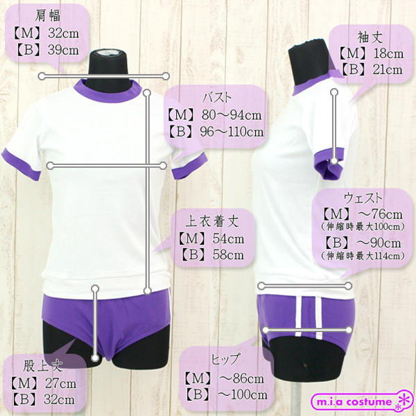BIGサイズ B96〜110cm・W〜90cm(伸縮時最大114cm)・H〜100cm 上衣:着丈58cm・肩幅39cm・袖丈21cm ブルマ:股上丈32cm セット内容:上衣、ブルマ 素材:ポリエステル65%、コットン35% |