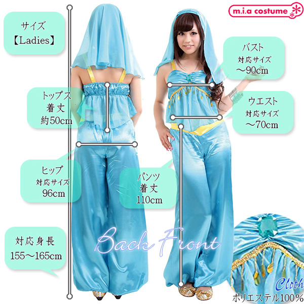 Ladiesサイズ:B〜90cm・W〜70cm・H〜96cm・身長155〜165cm・トップス丈50cm・パンツ丈110cm セット内容:カチューシャ、トップス(かぶるタイプ)、パンツ(横ファスナー) 素材:ポリエステル100% |
